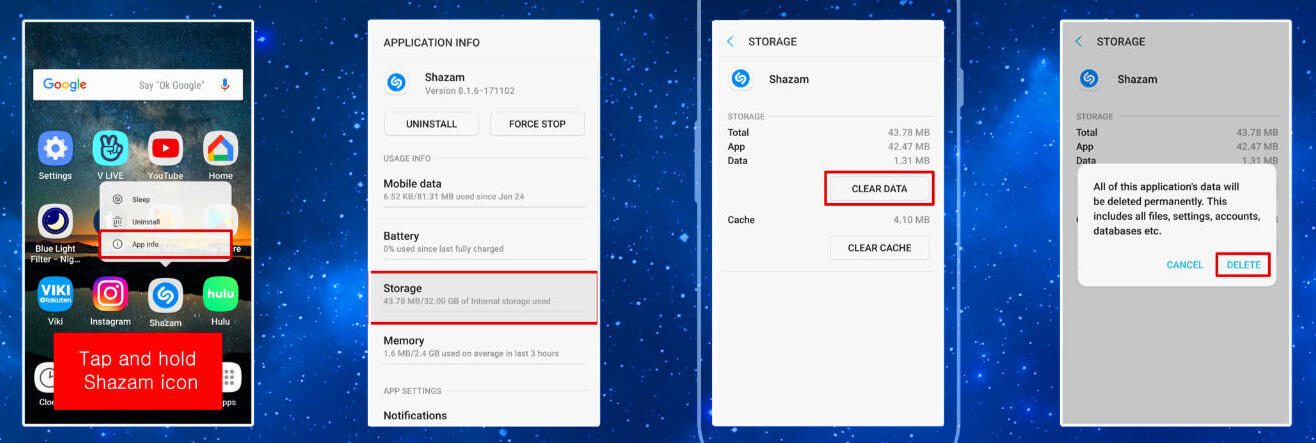 Using Android devices, you can Shazam the same song as many times as you want, if you always CLEAR DATA after EVERY Shazam. Note that CLEAR DATA is different from deleting Shazam history, so please make sure to read the screenshot tutorials below thoroughly.